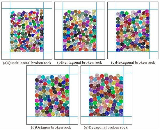 The particles in the geometry function were defined as the caving rock mass group, the particles between the caving rock masses were defined as other groups, and the other groups were deleted. Based on this method, different shapes of caving rock masses in the two-dimensional case were obtained in order to obtain the change trend of the compaction characteristics and the water permeability of the broken rock masses of different shapes. Therefore, the study selected quadrilateral, pentagonal, hexagonal, octagonal and decagonal broken rock mass shapes for research, as shown in Figure 3.