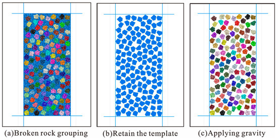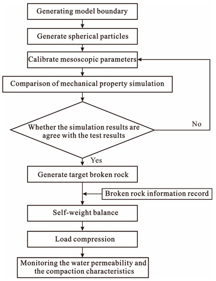 The use of 3D simulation of broken rock masses with different shapes may lead to dimensional disasters, such as the selection of 3D shapes. Due to the large number of particles in the calculation, the effects of calculation efficiency, the visual observation of particle breakage and possible dimensional disasters in 3D simulation were considered. In this study, 2D particle flow was used for analysis. The particle flow procedure was divided into five steps: model establishment, the generation of caving rock masses, self-weight balance, loading, and monitoring the water permeability and the compaction characteristics. The detailed flow is shown in Figure 4.