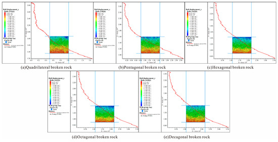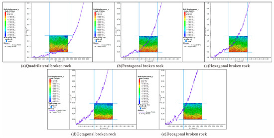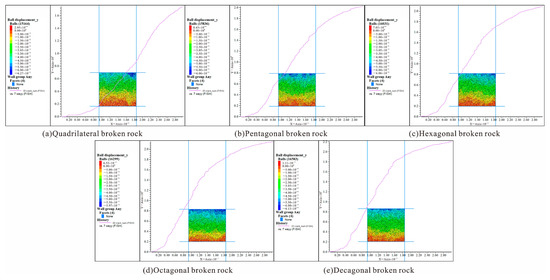 The crushed rock was gradually compacted and deformed under the pressure of the overburden rock. Five different prism-number particle clusters—tetragonal, pentagonal, hexagon, octagonal and decagonal—were obtained to establish test samples, and the numerical simulation of lateral compression was carried out. The numerical simulation results are shown in Figure 7.