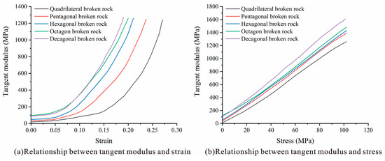 Figure 9b shows the relationship of the tangential modulus of the caving rock masses with stress in different shapes of rock mass. The tangential modulus of the caving rock masses of different shapes exhibits a slight difference when the stress is small. With a continuous increase in stress, the tangential modulus gradually increases [18]. The tangential modulus of the caving rock masses with a larger number of edges increases at a faster rate than that of the caving rock masses with fewer edges.