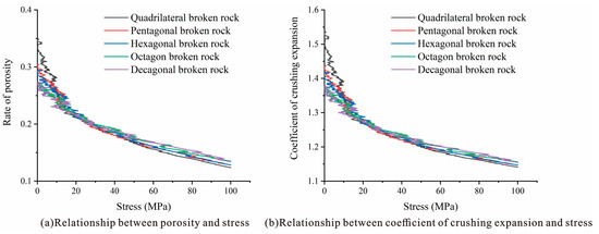 Figure 12b shows that the coefficient of the collapse and expansion of the caving rock masses of different shapes varies in the range of 1.15–1.55 as a whole with increasing stress and continuously decreases with increasing stress. The trend of overall change is the same as that of porosity. The coefficient of the initial collapse and expansion of the caving rock masses with few edges is higher than that of rock masses with many edges, but the coefficient of collapse and expansion of those is smaller at the later stage of compaction.