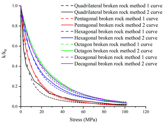 As shown in Figure 16, the relationship curve between the water permeability coefficient ratio and the overlying load is shown. The dotted line in the figure shows the evolution trend of the water permeability coefficient ratio of broken rock masses of different shapes obtained through an empirical formula. The solid line in the figure is the change relationship between the modulus and the pressure brought into numerical simulation, and the evolution trend of the water permeability coefficient ratio of broken rock masses of different shapes is obtained. It can be seen from the figure that the evolution curve of the permeability coefficient ratio obtained by the two methods has good correspondence. The evolution trend of the water permeability coefficient ratio of the fractured rock masses of different shapes is similar, showing a logarithmic relationship. With the increase in stress, the water permeability coefficient decreases gradually. When the stress reaches 80 MPa, the water permeability coefficient ratio changes, becoming stable. The smaller the number of broken rock edges, the faster the ratio of the breaking water permeability coefficient decreases in the initial compaction stage, and the smaller the ratio of the final water permeability coefficient. This is due to the smaller sphericity and irregular shape of the broken rock masses with fewer edges, resulting in less contact points around it and poor strength. When the same normal stress is given to the broken rock masses, stress concentration easily occurs, the broken rock masses are more damaged, and the water permeability coefficient decreases faster. To sum up, the larger the number of edges on broken rock masses, the smaller the loss of the water permeability coefficient under the same compaction state.
