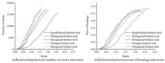 As shown in Figure 17, the numerical simulation results of the crushing rate of caving rock masses with different shapes are shown. Figure 18a shows the relationship between the number of cracks and the strain in different shapes of caving rock masses. The contact between the particles in the caving rock masses is realized by parallel bonding and linear contact. Particle breakage will degrade the parallelly bonded fracture into linear contact. Therefore, the degree of fracture for the caving rock masses is indicated by monitoring the number of parallel bonded fractures. The growth of cracks in different shapes of caving rock masses presents three stages: slow-fast-slow. The more edges there are in the caving rock masses, the earlier the crack number enters the rapid growth stage and the faster the growth rate. When the rock masses are compacted to 80% of their ultimate strain, the growth in the crack number begins to slow again.