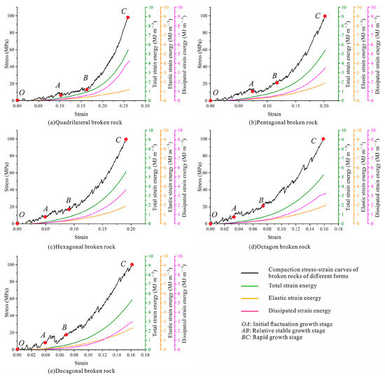 Figure 19 shows the evolution curves of the stress–strain curve, total strain energy (), elastic strain energy () and dissipated strain energy () during the confined compression compaction of broken rocks of different shapes. According to the characteristics of stress–strain curves and crack growth rules, the energy evolution characteristics during the failure process of rock with different shapes are divided into three stages [8]: initial fluctuation growth stage (stage I), relative stable growth stage (stage II) and rapid growth stage (stage III). In Figure 19, three stages of compaction of broken rocks of different shapes are marked on the stress–strain curves with red dots and identified with capital letters O~C. Although the stresses and stored energy in different stages of compaction and failure process of broken rocks with different shapes are different, the energy variation mechanisms of the caving rocks are similar and have undergone the above three stages.