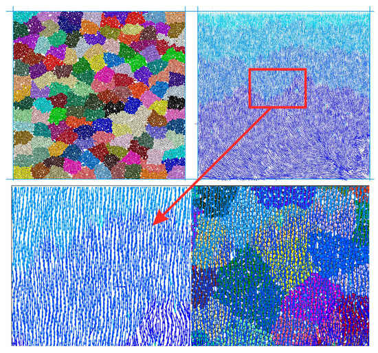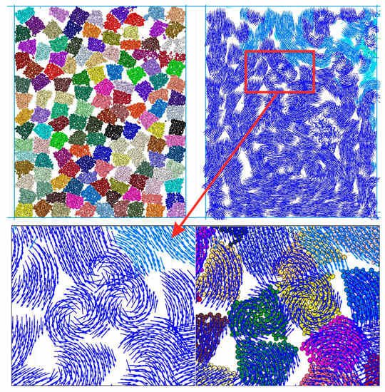 Using the movement state of the quadrilateral caving rock masses as an example, Figure 20 and Figure 21 show the movement state of the caving rock masses at the initial stage and the late stage of compaction, respectively. The movement state of the caving rock masses at different positions is different at different stages. Figure 20 shows that in the process of lateral compression, there is a gap between the broken rock mass, and in the process of compaction, the magnitude and direction of the force on each contact point are different, resulting in a compression effect, causing the broken rock mass to rotate. This is consistent with the motion law obtained from the real experiment in the reference Qin et al. [18]. The larger the gap, the larger the space for the broken rock mass to rotate. Many caving rock masses are squeezed by several surrounding caving rock masses, resulting in a state of rotary movement of the caving rock masses. From the location distribution of the caving rock masses, with the downward movement of the loading plate, the caving rock masses in contact with the loading plate initially moves downward as a whole and continuously drives the lower caving rock masses to move, resulting in a slightly higher movement speed of the upper caving rock masses than that of the lower caving rock masses, and the first failure occurs. The rotation mainly occurs in the middle upper part of the caving rock cylinder. The more obvious the rotation movement occurs in places with large pores [18]. The broken rock mass with lower porosity is difficult to continue to move downward. There is basically no rotational movement when friction occurs between broken rock masses.