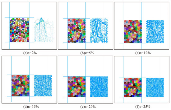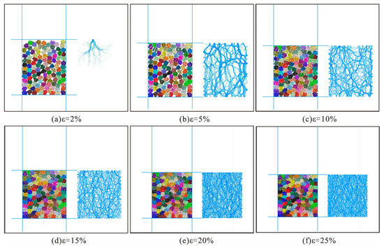 Force chain distribution of a pentagonal caving rock mass under different axial strains.