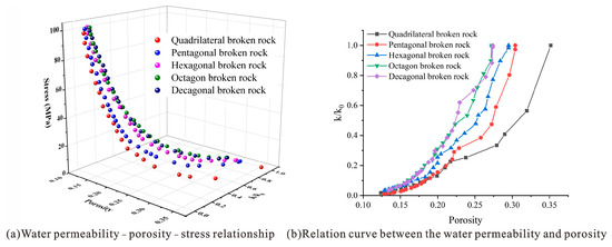 Figure 25 shows the relationship between the water permeability, the porosity and the stress of broken rock masses of different shapes. It can be seen from Figure 25a that with the gradual increase in stress, the water permeability and the porosity of broken rock masses of different shapes gradually decrease, showing a nonlinear change [14]. From Figure 25b, it can be seen that the water permeability of broken rock masses of different shapes is exponential with the porosity. With the increase in porosity, the water permeability gradually increases, and the growth rate also increases. Under the same porosity, the less edges there are on broken rock masses, the weaker their water permeability is. This is because with the increase in the overburden load, broken rock masses of different shapes move, rotate and break. The pores of broken rock masses are gradually filled, resulting in a reduction in the water permeability and the porosity. Under the same load and the porosity, the smaller the sphericity of broken rock masses, the more irregular the shape. In the process of compaction, the crushing rate is high, resulting in a reduction in the water permeability. Therefore, the impact of broken rock mass shape characteristics on water permeability during compaction should be considered in engineering construction, so as to reduce water inrush and well flooding accidents, and to timely adjust the recharge and drainage relationship in an underground water flow system.