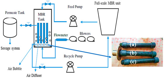 Flow diagram of pilot-scale MBR unit system, which utilizes main WWTP MBR as feed water source via feed pump, the pilot system used three Kubota plate type 0.4 µm membranes, aeration was achieved via three mini-blowers, excess sludge was taken from the reactor to WWTP MBR via recycle pump. Air diffusers with 1, 5, and 3 mm of perforated hole diameters ((a): 1 mm, (b): 5 mm and (c): 3 mm).