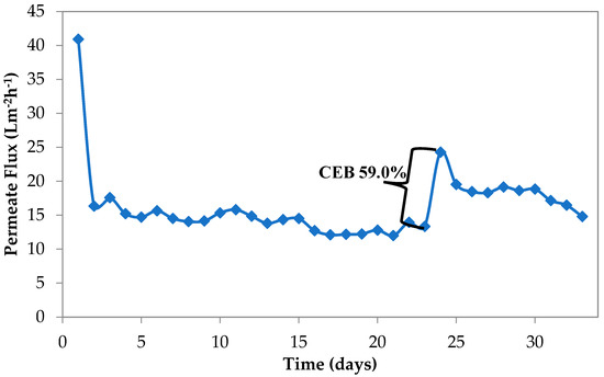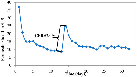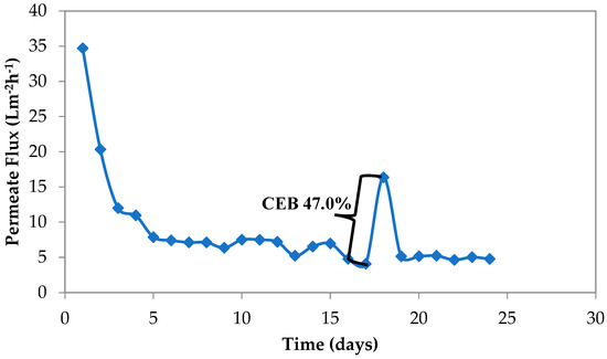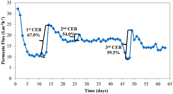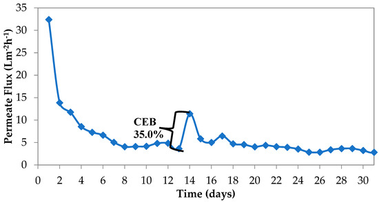 MBR membranes were cleaned by CEB for 1 h. Temperature corrected permeate flux during wastewater treatment was 24.82 Lm−2h−1 (after cleaning), which equals 67% of the initial flux. The system operated until the second CEB on the 27th day of operation was conducted. Flux recovery of second CEB (by maintaining CEB cleaning protocol explained in this section) was 54% this time. It was considered that decrease in permeate flux recovery was caused by inorganic salts accumulation on membranes with time.