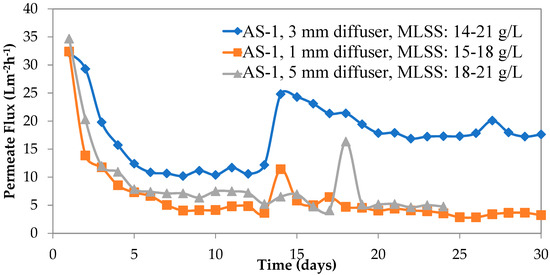 After membranes were cleaned, the permeate flux with wastewater was measured as 37.23 Lm−2h−1. The diffuser perforated diameter (3 mm) used in this study was maintained constant, as in the case of low MLSS concentration (Section 3.1.1). The AS dose was maintained as constant, as in the case of Section 3.1.1. AS-1 was employed at a concentration of 40 mg/L. There was a high flux drop in the first six days due to rapid accumulation of biomass on the surface of the membranes, and this was similar to the findings by Jarma et al. [47] and Skouteris [59]. Temperature-corrected permeate flux was partially stable around 10 Lm−2h−1 between the sixth and thirteenth days of the study, as shown in Figure 3. However, the permeate flux decreased below 10 Lm−2h−1 on the fourteenth day of the test.