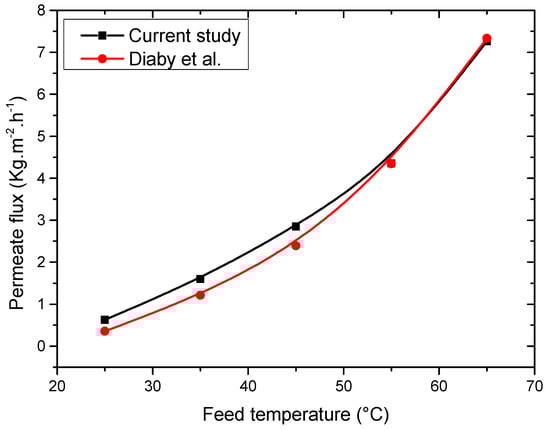 In this study, the experimental results obtained by Diaby et al. [48] were used to validate the model predictions. The evolution of the predicted and measured water vapor flow was compared at different feed water temperatures. It can be seen from Figure 2 shows that the temperature of the feed water affects how the permeate flow evolves. The permeate flow increases exponentially as the feed temperature rises. In this temperature range, the permeate flow goes from 0.625 to 7.03 kg.m−2.h−1 at a cooling temperature set at 15 °C and a cooling flow rate set at 5 L.min−1. This variation in permeate flow value is explained by the increase in the transmembrane force of water vapor. The obtained results are in concordance with those reported in the literatures [54,55]. The characteristics of PTFE membrane are listed in Table 3.