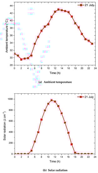 Figure 4 shows the global solar irradiation evolution with daytime for the month of July. The irradiation has a bell-shaped profile that is consistent with the prediction of well-known semi-empirical models from the literature. It is also noted that the highest temperature and solar radiation values are recorded on July 21, which is the most appropriate day to be considered in the present work.