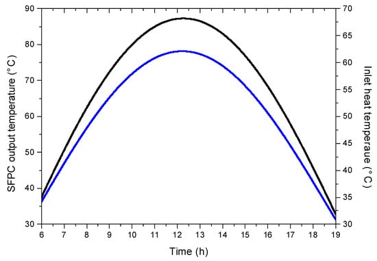 The inlet temperature of the hot channel Th,in corresponds to the change in the temperature of the heat exchanger over the hours within a day (Figure 5). It can be seen that Th,in increases and reaches its maximum (Th,in = 62 °C), with an air gap thickness of 1 mm and flow rate of 2 L.min−1 for different initial tank feed temperatures. This means that the output temperature of SFPC increases the inlet temperature in the hot channel; this is because the residence time of the feed solution is longer when the flow rate is lower.