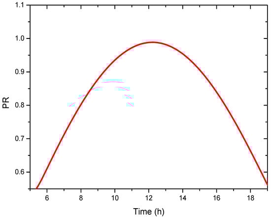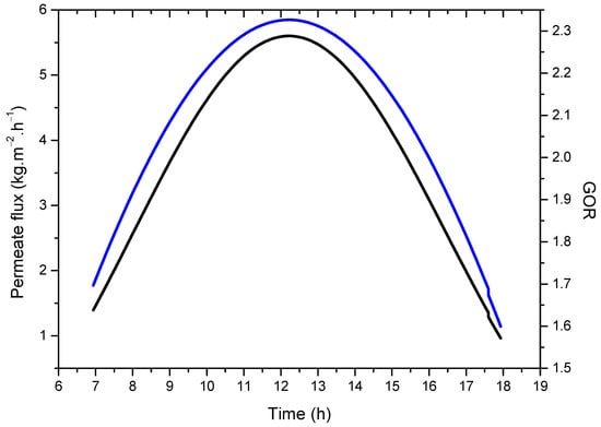 Figure 6 shows the permeate flux and GOR as a function of the local time. It can be seen that the permeate flux increases at the beginning of the day to reach about 5.6 kg.m−2.h−1 at a feed temperature of 62 °C and a flow rate of 0.01 kg.s−1 as the maximum value is obtained at 12:00 h. The obtained results show a good agreement with the results provided in the literature. The main performance parameters for thermal desalination system evaluation are gained output ratio (GOR). The larger GOR is, the higher the thermal energy utilized efficiency is [56]. From Figure 5, we can conclude that the GOR increases proportionally as the temperature difference across the AGMD membrane increases because of the increase in the amount of thermal energy needed to heat the feed water. However, as the feed temperature increases, permeate flux increases exponentially while the thermal energy consumption for heating the feed water solution increases. The maximum value of GOR = 2.3 is recorded at 12:00 h, mainly because of the maximum value of the hourly pure water. Figure 7 shows that the PR increases as the inlet temperature of the hot fluid increases in the same way as for the GOR and reaches its maximum PR = 0.98 at around 12:00 h. A high PR means that a high flow rate of distillate is obtained for a given thermal energy input. Usually, high PR can be achieved by using well-designed system components with high energy efficiency and good insulation material.