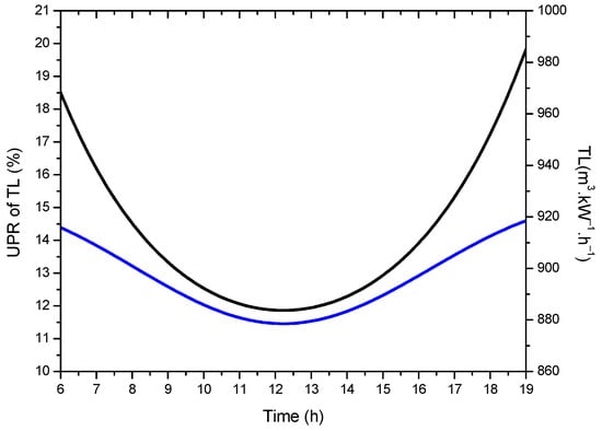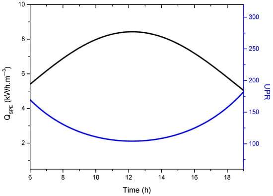 The variation of UPR% of the thermodynamic limit and the thermodynamic limit over the local time is shown in Figure 8. The UPR value of the solar AGMD system is found to be 187.89, which is much higher compared to desalination processes reported in the literature such as MED-TVC (UPR = 102.2), MED (UPR = 88) and RO (UPR = 86). This is mainly because AGMD uses low-grade vapor, which contains a very small percentage of the primary energy. Furthermore, the obtained results show that the solar AGMD system is operating at 20.43% of the ideal or thermodynamic limit and is close to achieving sustainable desalination, which ranges from 25% to 30% of TL [50]. Variations of Standard Primary Energy and the Universal Performance Ratio over the local time are shown in Figure 9. It can be seen that the maximum QSPE value for the AGMD solar system is found to be 8.43 kWh.m−3 which is similar to the results obtained during desalination processes reported in the literature, such as MSF (QSPE = 8.22 kWh.m−3), RO (QSPE = 7.12 kWh.m−3), MED (QSPE = 6 kWh.m−3) and MED-TVC (QSPE = 5.3 kWh.m−3). Therefore, Standard Primary Energy Consumption allows the efficient comparison of all desalination processes.