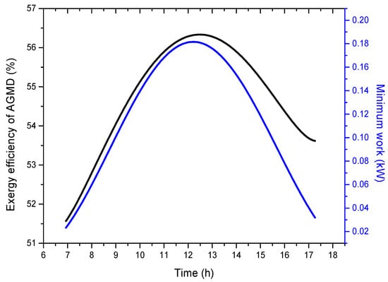 Variation of exergy efficiency of AGMD andthe minimum separation work with time.