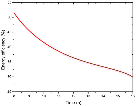 Figure 11 and Figure 12 illustrate the performance curves of the solar collectors that were tested during the study. It is important to note that the exergetic efficiency recorded was notably lower than the energy efficiency, with the highest energy yield recorded at 52% and the maximum exergy efficiency at 4.45%. Energy efficiency solely measures the quantity and does not provide a thorough evaluation of the various losses that may occur in solar collectors. The results obtained in this study are similar to those found by Banat and Jwaied [21] and Miladi et al. [34], who recorded maximum exergetic efficiency values of 6.5% and 5.03%, respectively, and maximum energetic efficiency values of 55% and 48.12%, respectively. The energy forms indicated that the solar collector field is effective from an energy perspective but not from an exergy perspective. According to the energy profile, the solar collector field is efficient from an energy viewpoint and inefficient from an exergy viewpoint. Hence, performing an exergetic analysis of other solar field elements would provide the opportunity to make decisions that are more efficient and prevent membrane degradation.