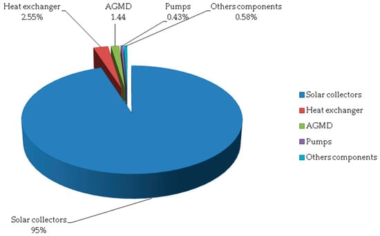 The key outcome of the exergy analysis is the identification and quantification of the portions of exergy destroyed in each component. This result enables the measurement and recognition of the exergy loss areas, as well as the target components or sub-systems responsible for inefficiency. Thus, the error is determined. Figure 13 displays the distribution of exergy destruction in the AGMD, heat exchanger pumps, and flat plate collector. It can be observed that the majority of the total exergy loss, 95%, takes place in the solar collectors. However, the heat exchanger is the next significant source of exergy destruction, accounting for 2.55% of the total exergy loss, while the AGMD contributes to only 1.44% of the total energy loss. This disparity is primarily due to the different temperature values between the flat plate collector, heat exchanger, AGMD, and pumps.