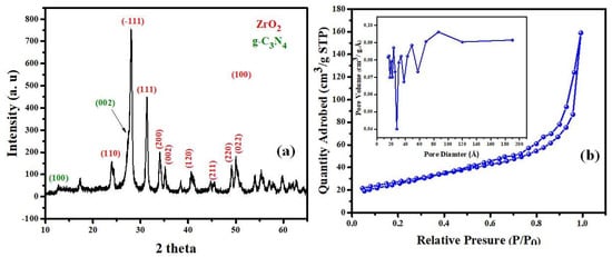(a) XRD pattern; (b) N2 sorption–desorption isotherm of Zr-G-C3N4 sorbent. The inset in (b) presents the pore size distribution.