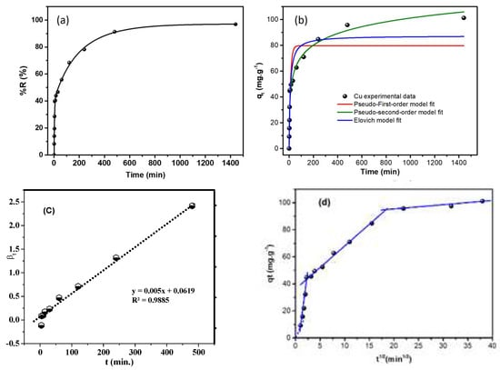 In order to obtain an insight into the process that governs the adsorption of Cu ions, the kinetic measurement is often conducted using various kinetic models (Table 1). The obtained experimental data may be well fitted by the pseudo-first-order (PFO), (the pseudo-second-order (PSO), the Elovich, and the intraparticle diffusion (IPD) models as depicted by the nonlinear model fittings in Table 1 and Figure 4.