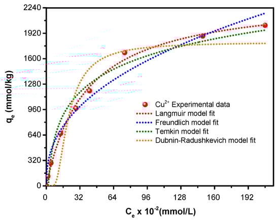 The PSO model rate constant (k2) and ultimate adsorbed amount of Cu2+ ions were 5.6 × 10−3 g·mg−1·min−1 and 90 g·mg−1, respectively. The almost-equal values of the calculated (90 g·mg−1) and experimentally (87 g·mg−1) adsorbed amount and the large rate constant (k2), as well as the strong correlation coefficient close to the unit (i.e., 0.9984), demonstrate that adsorption follows the PSO kinetic model (e.g., Table 1 and Figure 3) [].