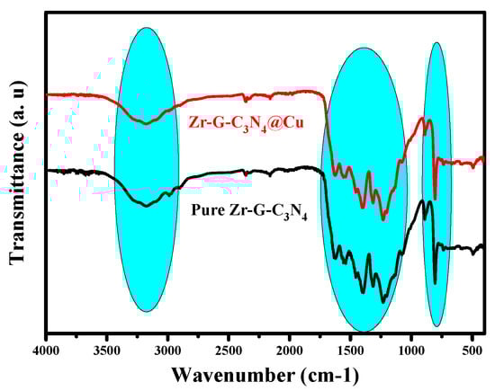 The EDS spectrum of Zr-G-C3N4 (Figure 2c) contains the peaks related to C, N, O, and Zr, confirming once again that the purity of the as-fabricated nanocomposite material made of graphitic carbon nitride and zirconium oxide corroborates the literature [,], and EDS elemental mapping indicates homogenous distribution Figure 2d–g.
