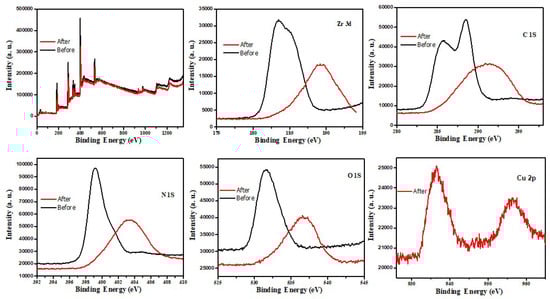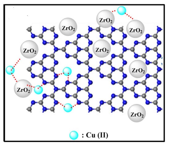 Interestingly, both precursors used for the Zr-G-C3N4 fabrication are biocompatible where ZrO2 finds medical application in dentistry and biomedical implants without adverse reactions [,], while G-C3N4 is employed as an anode in microbial fuel cells [] and human-safe antimicrobial agents []. Therefore, this paper aims to prepare a harmless Zr-G-C3N4 nanosorbent to treat wastewater contaminated with copper ions, one of the most prevalent hazardous heavy metals. Using thermal pyrolysis, Zr-G-C3N4 sorbent was fabricated. XRD, SEM/EDX, and FTIR analyses were carried out to examine nanomaterials’ structure, morphology and chemical composition, specific surface and pore size, and functional groups. The effect of operational parameters such as contact time and pH on the adsorption capacity of Cu ions was investigated. Moreover, kinetic and isothermal adsorption tests were conducted. A plausible mechanism of Cu2+ ion adsorption onto Zr-G-C3N4 sorbent was discussed and proposed.