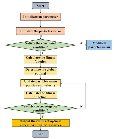 The solution steps of the PSO algorithm are shown in Figure 2. In this process, the quantity of water use unit and water supply unit in the study area is represented by the number of “particles”. The initial magnitude of the water supply value is represented in the model by randomly generated numbers. The minimum water demand per unit of regional water use, the maximum water demand per unit of water supply, the non-negative of water volume, the water quality relationship between units of water use and units of water supply and other constraints are used to control the change of the model “particle” to ensure that the variable space of “particle” has practical significance. The water resources allocation scheme achieved in a single iteration is optimized according to the fitness function determined for different purposes. When the convergence condition is reached, the model jumps out of the loop and finally achieves the optimal configuration result.