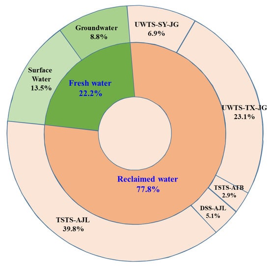 The composition of water users in the study area is diverse. The water sources from 2015 to 2020 are shown in Table 2. It can be seen that the water consumption of surface water ranges from 2.06 million m3 to 4.74 million m3, and the water consumption decreases year by year. The groundwater consumption is 1.57~2.78 million m3, and it also decreases year by year. The water consumption of reclaimed water is 4.5~7.8 million m3 and increases yearly. From 2015 to 2020, the proportion of reclaimed water use was 37.7%, 45.5%, 53.6%, 58.7%, 67.7%, and 65.6%, respectively. It indicates that the water use structure tilts to renewable water resources year by year, the proportion of fresh water use decreases year by year, and the water-saving measures have achieved good results.