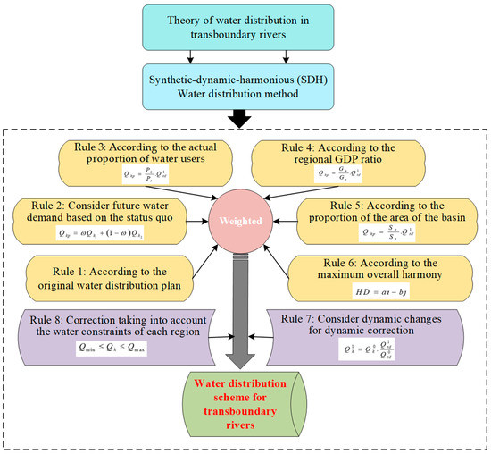 The calculation process of the water distribution scheme is illustrated in Figure 3. This method can be summarized as a dynamic and coordinated water distribution method for transboundary rivers based on water distribution ideas, water distribution principles, and water distribution rules. It accounts for natural and human elements, and coordinates the relationship between man and water. This kind of water distribution method for transboundary rivers is called the “synthesis–dynamic–harmonious water distribution method”, also referred to as “SDH”.