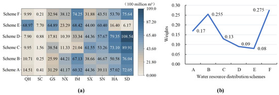 First, according to schemes (A) and (B) (Table 2), the water distribution for Hebei and Tianjin is calculated. As shown in Table 2, according to the weight, the final water distribution for Hebei and Tianjin is 976 million m3. Secondly, the remaining water supply of 36.024 billion m3 will be distributed to nine provincial administrative regions in the basin, according to six schemes, as shown in Figure 6a. Finally, according to the weight of each scheme obtained (Figure 6b), the final water quantity and water proportion of each province are calculated (Figure 7), and compared with the 1987 water quantity scheme (Figure 8).