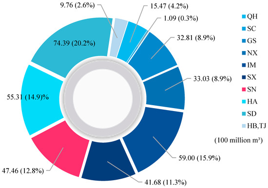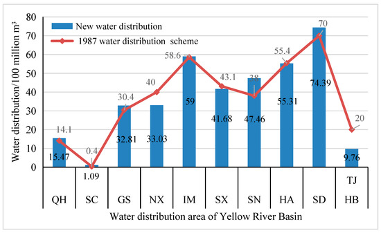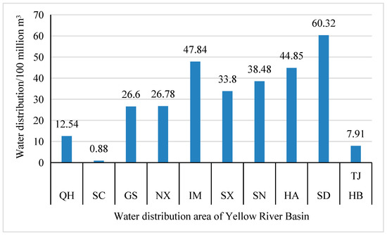 The water distribution scheme is dynamic and changes year-on-year with the change in the amount of water distributed, and can be adapted according to Equation (6). Here, only 30 billion m3 of distributable water of the Yellow River is taken as an example for illustration purposes (refer to Figure 9). Supposing that the distributable water volume is not 30 billion m3, the calculation can be done similarly.