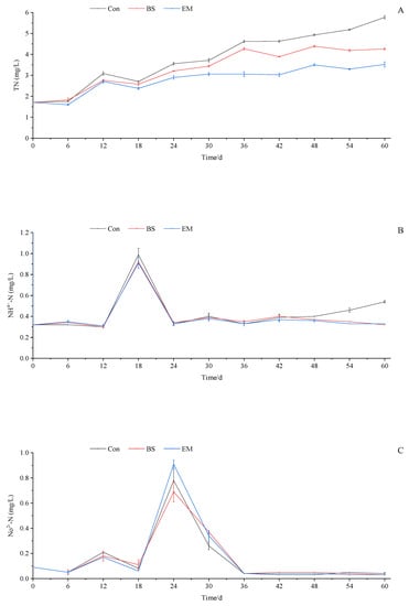 As shown in Figure 1, the total nitrogen concentration of each group showed an upward trend during the experiment, and the total nitrogen concentration of the BS group and the EM group was significantly lower than that of the Con group (p < 0.05). The concentration of ammonia nitrogen in each group first increased, then decreased, and then stabilized. The concentration of ammonia nitrogen reached its maximum on the 18th day. The concentration of ammonia nitrogen in the BS and EM groups was significantly lower than that in the Con group on the 48th, 54th, and 60th days (p < 0.05). The concentration of nitrite nitrogen in each group first increased, then decreased, and then tended to remain stable. Nitrite nitrogen concentration reached its maximum on the 24th day. There were no significant differences in the concentration of nitrite nitrogen between the groups (p > 0.05).