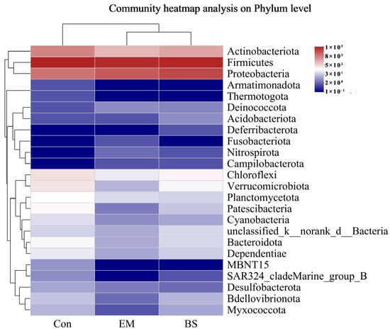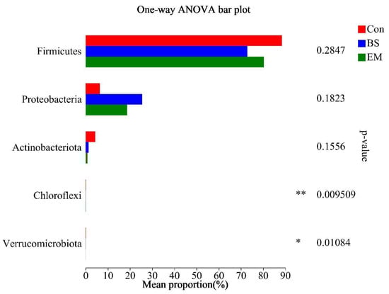 The dominant bacteria at the biofloc level were analyzed. The results are shown in Figure 2. The top four dominant bacteria in biofloc abundance were Firmicutes, Proteobacteria, Actinobacteriota, and Chloroflexi. The abundance of Chloroflexi and Verrucomicrobiota decreased significantly in the BS group and the EM group (p < 0.05) (Figure 3).