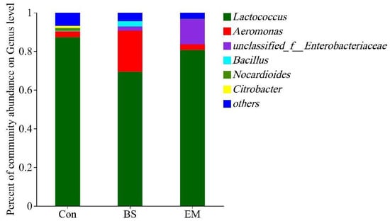 The dominant flora of the genus biofloc level was analyzed and the results are shown in Figure 4. The three main dominant bacteria in the Con group were Lactococcus (87.31%), Aeromonas (2.98%) and Nocardioides (1.50%). The BS group were Lactococcus (69.40%), Aeromonas (21.26%), and Bacillus (2.69%). The EM group were Lactococcus (80.66%), unclassified_f_Enterobacteriaceae (13.19%), and Aeromonas (2.86%). Compared to the control group, BS group significantly increased the abundance of Bacillus (p < 0.05) (Figure 5).