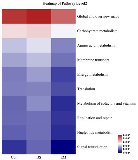 PICRUSt2 was used to predict the function of intestinal flora at level II. The functional abundance values of global and overview maps, carbohydrate metabolism, amino acid metabolism, membrane transport, energy metabolism, translation, metabolism of cofactors and vitamins, replication and repair, nucleotide metabolism, and signal transduction in BS group were significantly higher than those in Con group and EM group (p < 0.05) (Figure 6).
