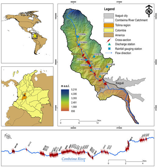 The hydrological and hydraulic modeling of the Combeima river catchment, located in the intertropical convergence zone in Colombia, was carried out (Figure 1). The basin has a drainage area of 274 km2 and an elevation range between 5150 and 700 m a.s.l. It has a bimodal rainfall regime with an annual average of 1816 mm and an average temperature of 16 °C. The main stream is predominantly mountainous with a length of 57.4 km, an average slope of 8.47%, and an average and maximum annual flow of 4893 and 8828 m3 s−1, respectively. At elevations above 4000 m a.s.l., there is paramo vegetation, and in the rest of the basin, there are evergreen forests, subsistence crops, and grassland areas with scattered bushes.
