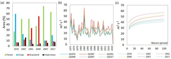 Hydrological response by land–use change period. (a) land–use areas, (b) annual maxima, and (c) flood quantiles.