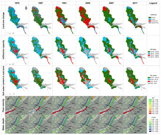 Simulated variations of land-use change, soil infiltration capacity (CN), soil water content in the root zone (Hu), stream flow velocity (), and water depth () (in order, from top to bottom) related to land-use change during the 1976–2017 period in sections S48–S53 located in the lower part of the stream reach analyzed.