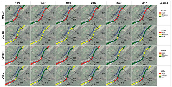 Changes in physical vulnerability in the 1976–2017 period applying the four methods analyzed. MFLUP: vulnerability and mapping of floods based on land-use patterns; VLUCS: vulnerability in land-use change scenarios; VFVCN: vulnerability based on flow velocity and curve number; VVHu vulnerability based on soil water storage variation.