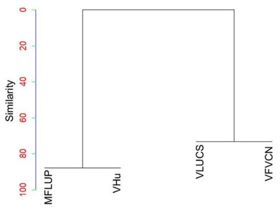 Based on the results obtained from the evaluation of physical vulnerability using four methods in different analysis scenarios, only those cases in which there were coincidences in the levels of vulnerability in each cross-section evaluated were selected for performing an AHC. The analysis indicates that VVHu shows 90% similarity with MFLUP. Likewise, VFVCN presents a similarity of 70% with respect to VLUCS (Figure 7). Therefore, the methods proposed in this paper, i.e., VVHu and VFVCN, exhibit a high similarity in relation to MFLUP and VFVCN [37]. These are based on the vulnerability evaluation concerning the level of exposure of structures near streams and morpho-edaphological characteristics of the basin. Thus, the methods proposed in this research are a new approach to evaluating physical vulnerability since they are based on analyzing the variation of the hydraulic properties of the soil (Hu and CN), and flow velocity () in the cross-section where the exposed structures are located.