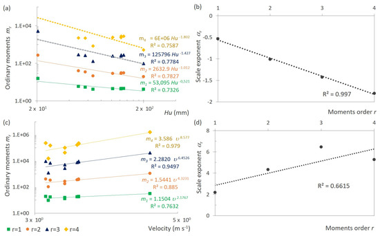 Logarithms Hu and with respect to () showed a broad, simple scaling (Figure 8a,c) since they present linearity in order r moments for each scale (Figure 8b,d). Regressions for scale Hu showed R2 values between 0.7587 and 0.7647. In the case of scale , R2 values varied between 0.5839 and 0.7751. These results indicate that both the current flow velocity and the soil water storage in the root zone represent the effect of land-use change in the basin on the hydraulics of the current (flow) directly in contact with the exposed structures.