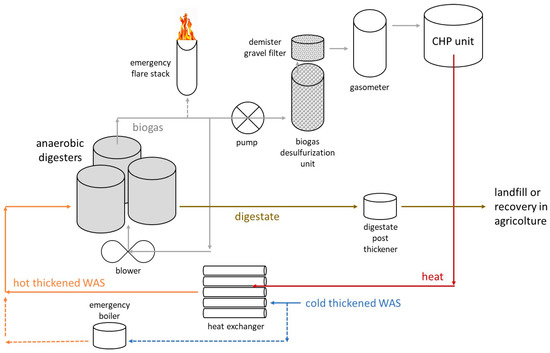- Sanaye, S.; Yazdani, M. Energy, exergy, economic and environmental analysis of a running integrated anaerobic digester-combined heat and power system in a municipal wastewater treatment plant. Energy Rep. 2022, 8, 9724–9741. [Google Scholar] [CrossRef]