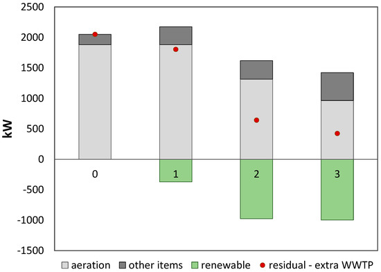 - The implementation of an oxic—anoxic partition of the CAS tank, other than AD and primary sedimentation, (Scenario 3) allowed the WWTP to reduce its electric energy demand from external sources to only 20% of that of Scenario 0, thus avoiding the emission of 4390 tons CO2 equivalent/y. The present requirement on the nitrogen concentration in the wastewater to be discharged or reused for mining activities does not require the presence of nitrification–denitrification processes. However, a nitrification—denitrification scheme makes it possible to consume an aliquot of the residual biodegradable organic substance at no free oxygen expenses, thus saving the corresponding aliquot of electric energy necessary for the aeration process.