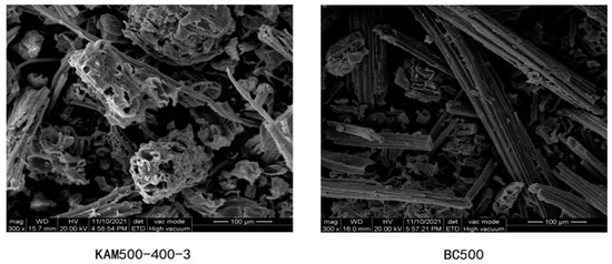 The surface morphologies of bamboo charcoal, as well as modified bamboo charcoal, are shown in Figure 1. Figure 1 shows the surface morphologies of unmodified BC500 and KAM500-400-3-modified charcoal, respectively. As can be seen from Figure 1, the surface of unmodified BC500 is smoother, and the char is mainly tubular in shape with a relatively intact structure. The surface of KAM500-400-3 after KOH activation showed a lot of collapse and unevenness; its structure was far from that of BC500, and large pores were clearly visible in the cross section.