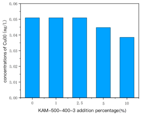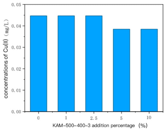 The effect of the amount of KAM-500-400-3 on the Cu(II) concentration in the pore water of single Cu(II)-contaminated sediment is shown in Figure 3, and its pattern was similar to that in the overlying water. When the added amount of KAM500-400-3 was 1% and 2.5% of the sediment mass, we found no obvious change in the Cu(II) concentration compared with that in the sediment without KAM500-400-3. When the amount we added was further increased to 5% and 10%, the corresponding concentration of Cu(II) in the pore water gradually decreased. When we added a small amount of KAM500-400-3, the effect on Cu(II) in the pore water was also weak. When the amount of KAM500-400-3 that we added was greater than or equal to 5% of the sediment mass, the Cu(II) concentration in the pore water of the sediment was lower than that when the added amount of KAM500-400-3 was low, which further proved that KAM500-400-3 has a certain fixing effect on the heavy metal Cu(II) in sediment [25,26,27].