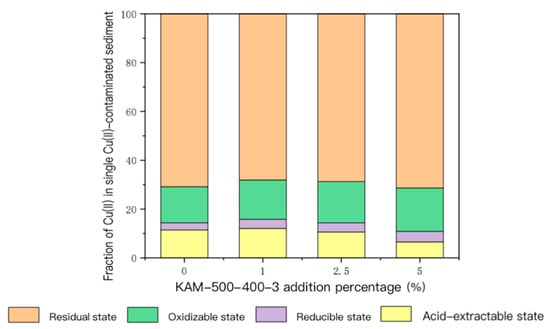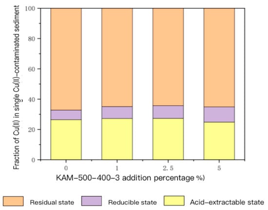 According to the BCR extraction method, the forms of heavy metals in sediment can be divided into acid-extractable, reducible, oxidizable, and residue states according to the biological availability from the most to the least. In general, heavy metals with high bioavailability cause more harm to the environment due to their strong migration ability and toxicity, so heavy metals with low bioavailability are relatively stable [33,34,35,36]. The morphology of Cu(II) in single Cu(II)-contaminated sediment continuously extracted through BCR with different amounts of KAM500-400-3 is shown in Figure 4.