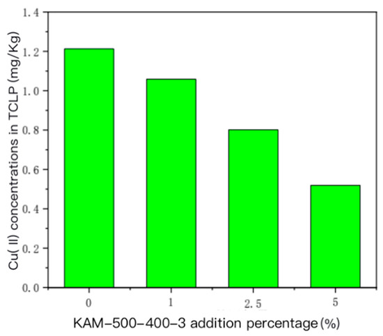 The TCLP-extractable concentration of Cu(II) in single Cu(II)-contaminated sediment with different amounts of KAM500-400-3 is shown in Figure 4. According to the experimental results, when the dosage of KAM500-400-3 was 0% (blank control), 1%, 2.5%, 5%, and 10%, the concentration of Cu(II) in the sediment extractable through TCLP was 2.34, 2.26, 1.81, 1.72, and 1.43 mg/kg, respectively [43]. When the dosage of KAM500-400-3 was 1%, 2.5%, 5%, and 10%, the concentration of Cu(II) extractable through TCLP was 3.42%, 22.65%, 26.50%, and 38.89% lower than that of the sediment without KAM500-400-3, respectively. The results showed that the TCLP toxic leaching concentration of Cu(II) in the sediment gradually decreased with the increase in the amount of KAM500-400-3 applied, which showed that the addition of KAM500-400-3 could inhibit this heavy metal in the sediment from entering the water body and could effectively fix the heavy metal Cu(II) in the sediment, thus reducing its leaching toxicity risk [44].