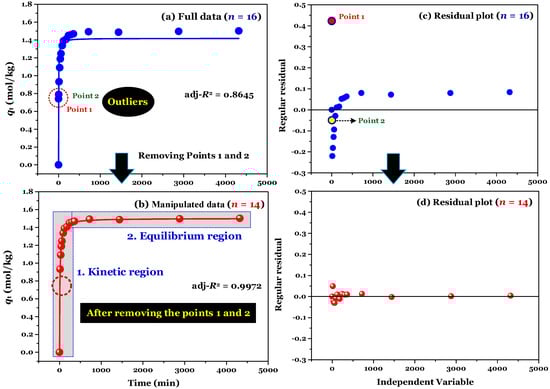 Considering Point 1 and Point 2 in all figures as potential errors, a manipulation was performed by removing Points 1 and 2 from the experimental data. As expected, after manipulating (n = 14), the experimental data of the time-dependent adsorption was adequately described by the PSO model, with the adj-R2 values being 0.9972 (for the nonlinear method), and 0.9731−0.9793 (for the linear form of Type 2–5; Table 1). Figure 1b shows that the experimental data (after removing Points 1 and 2 in Figure 1a) were well described by the nonlinear form of the PSO model (adj-R2 = 0.9972). Although the evaluation of regular residuals can be used to identify the potential errors within a dataset [11], it is not helpful for many cases. For example, Figure 1c shows that the outlier identification is only visible for Point 1.
