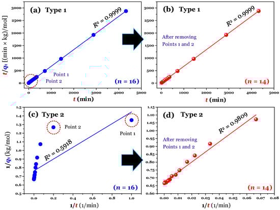 The linear forms (Type 1 and Type 2) of the pseudo-second-order model (a,c) before (n = 16) and (b,d) after (n = 14; Points 1 and 2 removed) data manipulated.